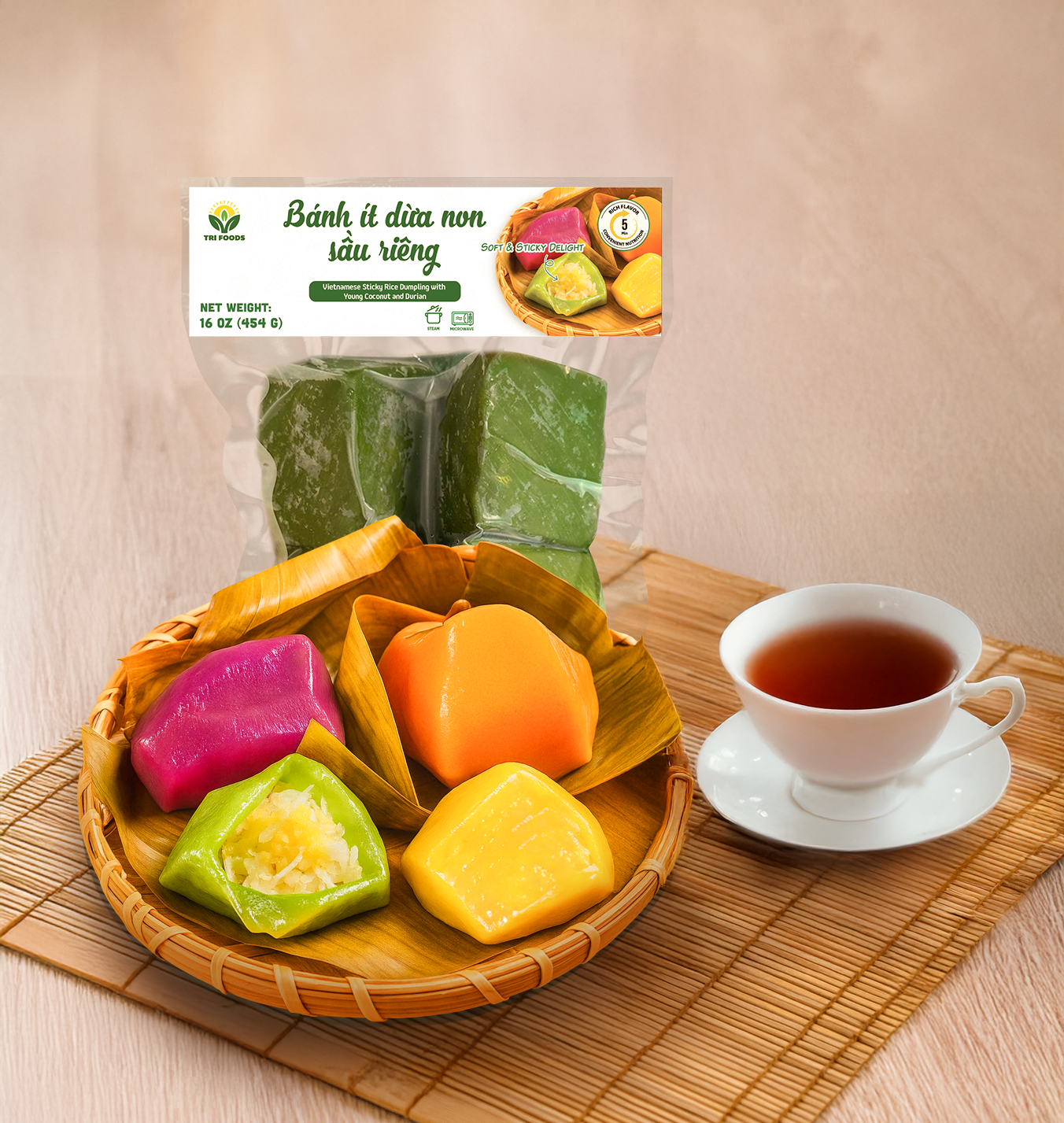 Nếu bánh ít truyền thống đã làm say lòng người bởi độ dẻo của nếp, thì phiên bản Bánh Ít Dừa Non Sầu Riêng từ Tri Foods chính là một cuộc cách mạng về hương vị. Đây là sự kết hợp táo bạo nhưng đầy tinh tế giữa cái sần sật của dừa non và hương thơm nồng nàn, béo ngậy đặc trưng của sầu riêng chín cây.